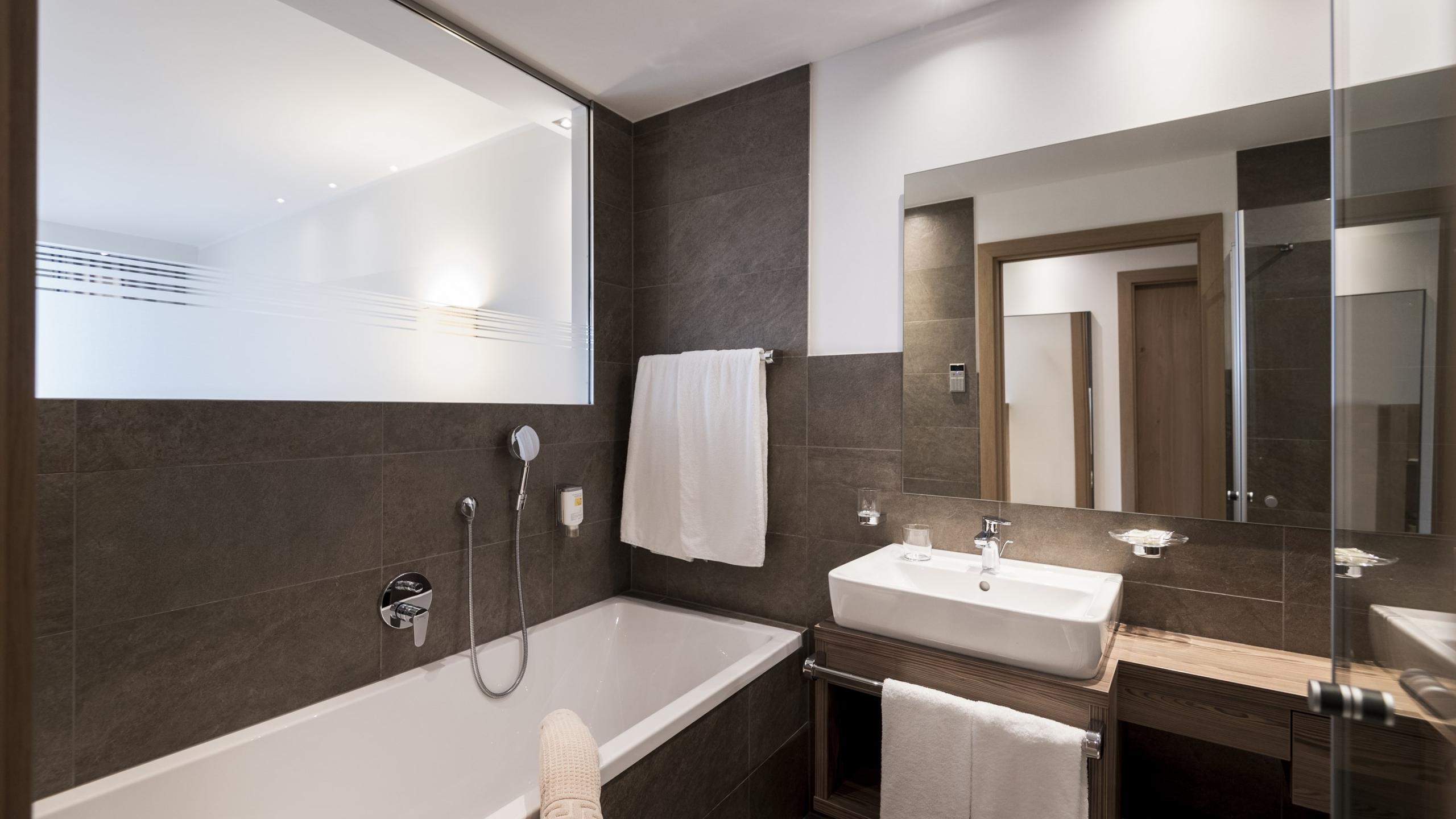 Ampia camera con vista montagna in legno di rovere e legno spazzolato con doccia e vasca, bidet, WC, asciugacapelli, telefono, sat-TV, cassetta di sicurezza, divano-letto, frigorifero e balcone.